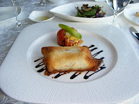 Here’s a picture of the octopus. I’m not usually a fan of squishy food, but this was divine. Honest! Can you see the tentacles? The chocolate raspberry cake was heavenly. Don’t you love how they smeared the chocolate with a pansy? A trick I’m going to have to remember.