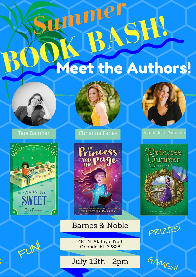 I’ll also be signing at The Summer Book Bash at Barnes and Noble at Waterford Lakes this Saturday from 2pm-3pm with Tara Dairman and Ammi- Joan Paquette. Go here for all of the details. There will be games and prizes along with plenty of fun. The best part? A portion of the sales will be used to help support our local library!